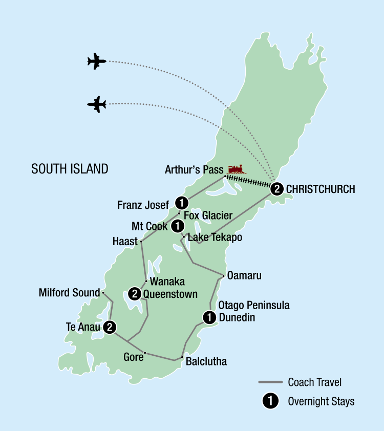 Explore the dramatic landscapes of the spectacular South Island on this 10 day tour. Start your tour in Christchurch, discover highlights such as the world-renowned TranzAlpine Rail Journey, view the snow-capped peaks of the Southern Alps along the rugged west coast, enjoy picturesque Queenstown, cruise on the majestic Milford Sound and visit historical Dunedin.Travel in a small group on the Ultimate Coach, providing a Business Class level of comfort, service and quality without compromise.